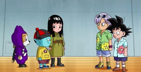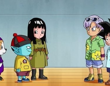 Examples: Gohan, Trunks, Goten, Bra and Bulla, plus background citizens with a clear mix of human + animal traits; some “odd” creatures can also be read as hybrids depending on their design.